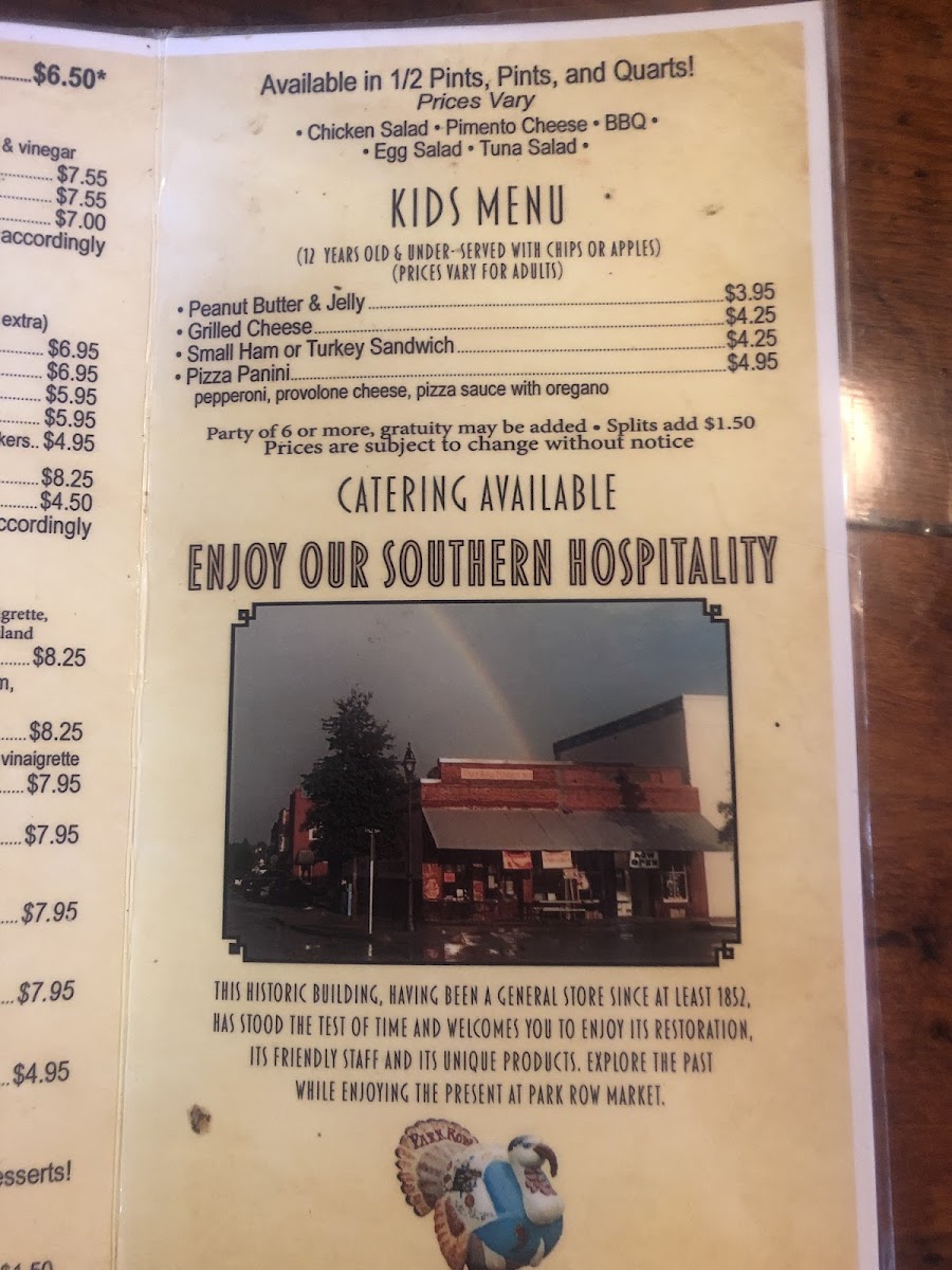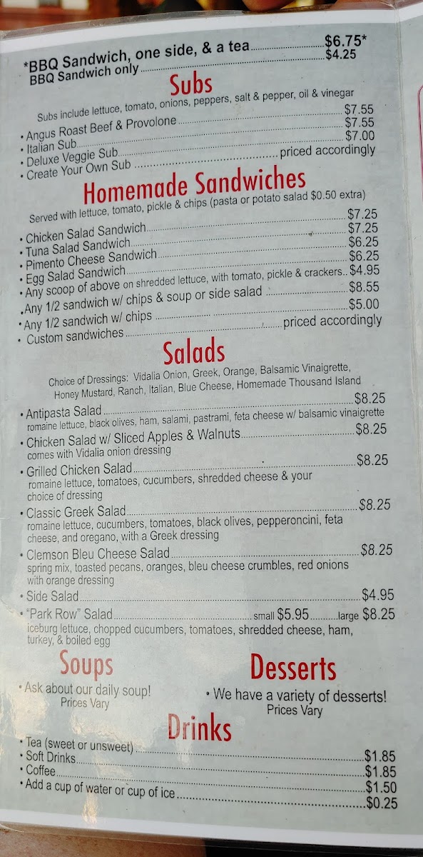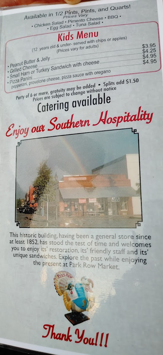 Welcome to Park Row Market No. 1, a delightful culinary gem located in the heart of Edgefield, SC. Nestled at 108 Courthouse Square, this charming eatery offers a menu that caters to a variety of tastes, ensuring a satisfying experience for everyone.